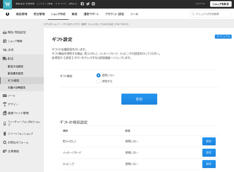 管理画面上部メニュー、ショップ作成から配送を開き、左メニューのギフト設定を開きます。
